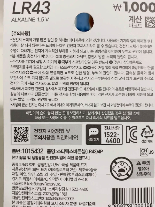 오늘 소개하는 LR43 알카라인 건전지는 다양한 모델과 호환이 가능한 만큼 두루두루 널리 사용되는 건전지입니다.
